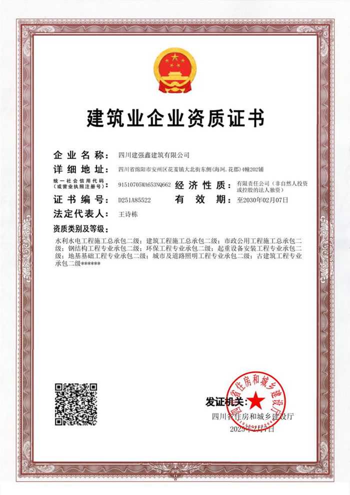 四川建強(qiáng)鑫建筑有限公司完成貳級資質(zhì)延續(xù)